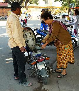 ![]() This woman sells gasoline, drinks from the cooler, and telephone service from her little "telephone booth" which indicates you can use her cell phone. |