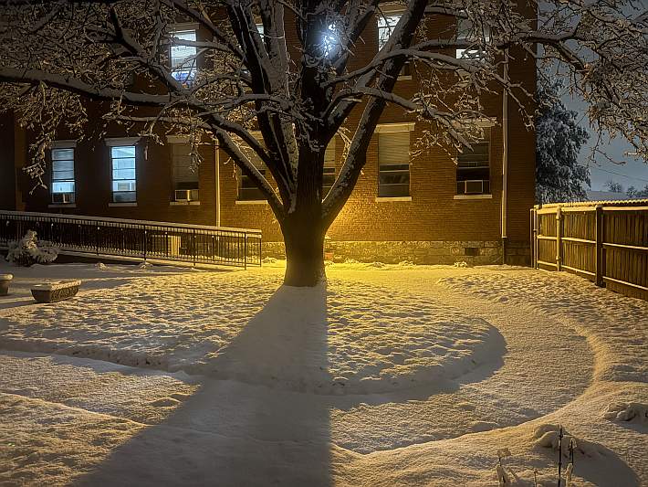 A week or two ago, we had a sprinkling of snow at Nazareth Home but it was gone in a couple hours. Overnight we had about 3″ of snow this time. This is a view at 6:15 AM in the little courtyard outside my room. It is a beautiful snow but it has really disrupted my plans.
