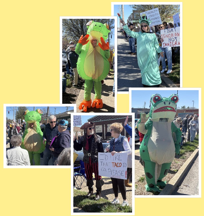 An interesting tactic used by Indivisible (the main organizer of the No Kings demonstrations) has been encouraging protestors to come in costumes, especially inflatable animal garb. The use of such outfits draws attention but it also tends to defuse dangerous or too-serious situations. And for observers and even heavily armed soldiers it might encourage reflection on what is going on when an ICE agent with an assault rifle is face to face with a cartoon character. Maybe it’s time to step back and try another approach. There were quite a few costumes in the crowd in Louisville on Sunday.