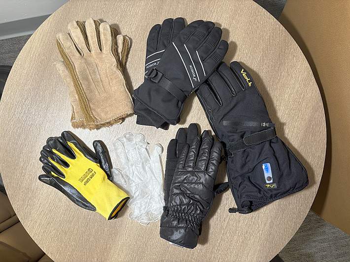 I tried all sorts of gloves to keep my fingers warm and tried putting a thinner pair of gloves inside heavy gloves but that didn’t work either. The large gloves on the right, with the blue lights on the cuff, are the ones that gave me relief. They have USB-charged batteries in those large cuffs.
