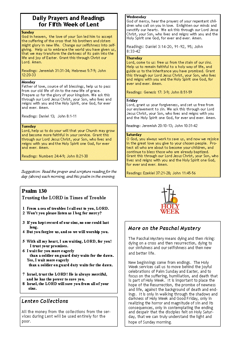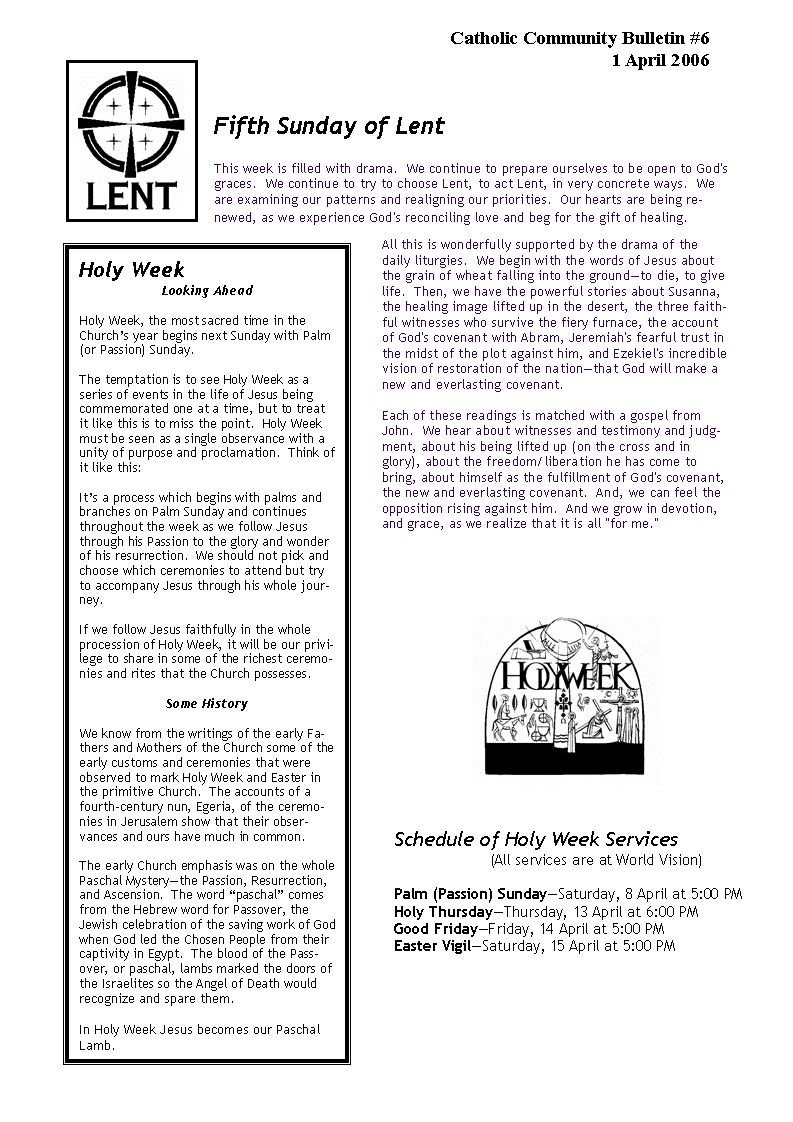 This is a hand-out for the 5th Sunday of Lent given to the English-speaking Catholic community at their one weekly liturgy on Saturday evening.
