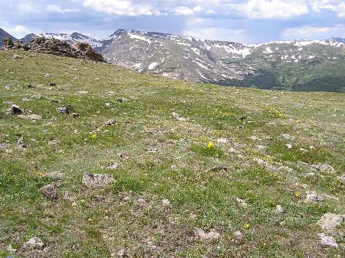 A section of the tundra, the ecosystem above the treeline in the Rockies, Alaska, and Siberia. At this level, the environment is very harsh, with snow possibile any day of the year, and the grasses and flowers have only a five to eight week growing season. Although the climate and environment is very harsh, the plants are quite delicate because they might grow only an inch in a decade.