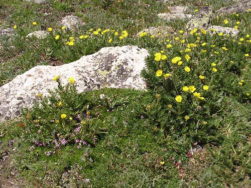 Tundra flowers. These flowers are quite small, with blossoms about one-half inch across. They grow close to the ground because of the winds which might be 30 MPH at eye level but only 3 MPH a couple inches off the ground.