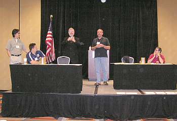In most years the "international" conference is limited to delegates from North America, but this year the ICDA's newest chapter, Chapter 134 from Trier, Germany, was represented by two deaf people, Maria Fiebus and Norbert Herres, and their hearing priest chaplain, Fr. Ralf Schmitz. They were a welcome addition to the conference. |